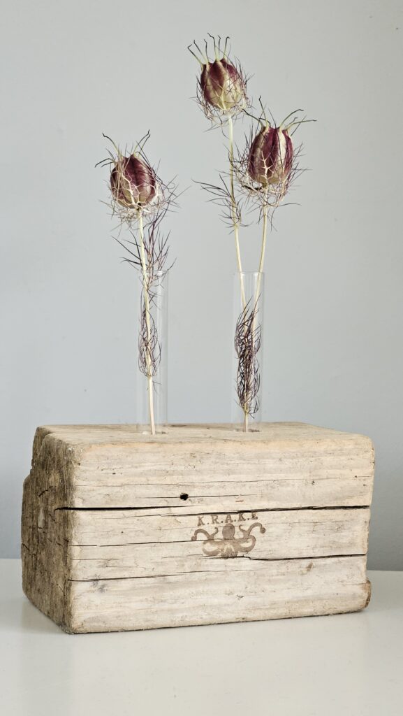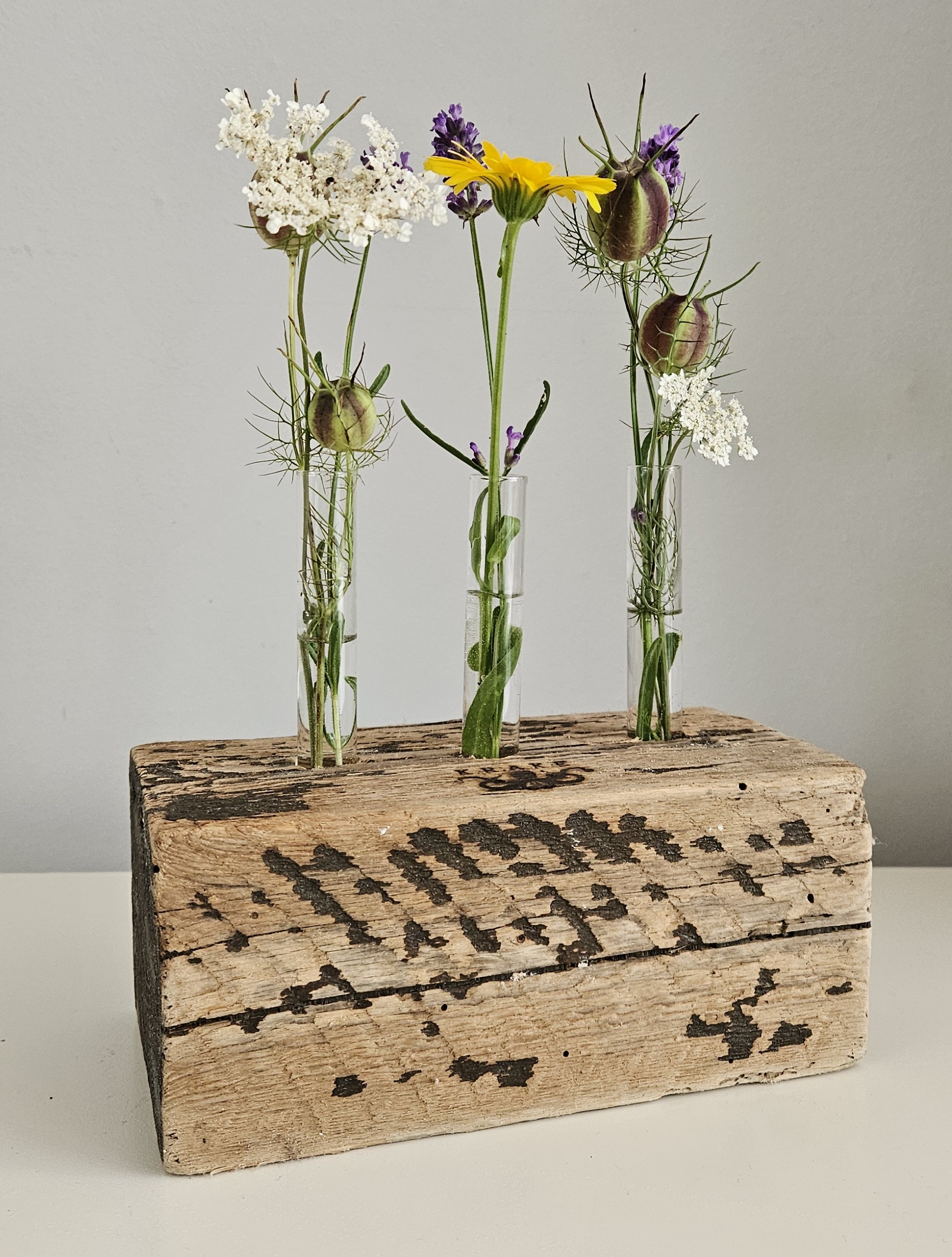 Holzklotz aus der Rheinkrake, Reagenzgläser aus Glas